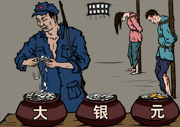 中共的一切都是搶來的。拉起紅軍搞武裝割據,軍火彈藥、吃飯穿衣需要錢,而「籌款」的形式是打土豪搶銀洋,與土匪沒有區別。李先念的紅軍在鄂西一帶綁票縣城裡的首富人家,不是綁一個,而是家族中每富裕家庭綁一個,叫「綁活票」。「綁活票」不「撕票」,即不殺人質,留下活口,目的是要家裡人一壇一壇不斷地送大銀元去供養紅軍。直到餵飽了紅軍,或是家破人亡,無油水可榨,才把奄奄一息的人質放回。有人因此被驚嚇折磨致死。