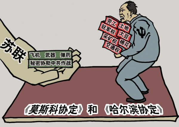 1947年至1948年,中共先後與蘇聯簽訂《哈爾濱協定》和《莫斯科協定》,出賣祖國權益和東北資源,換取蘇聯在外交和軍事上全面支持中共。雙方協定蘇共經常供應50架飛機補充中共,將收繳的日本武器分兩期全部給予中共,蘇方控制的東北的彈藥、軍用物資平價售給中共。國民黨一旦對東北發動兩棲登陸攻勢,蘇共秘密協助中共軍隊作戰。蘇聯協助中共奪取新疆控制權;建立蘇中聯合空軍力量;裝備中共11個師。把美國援助蘇聯的130億美元的武器的三分之一運入東北。中共為了獲取蘇聯支持,承諾蘇聯對東北陸路、空中交通的特權;對蘇提供國民黨政府和美軍行動情報;以東北物產、棉花、大豆、戰略物資供應蘇聯,換取精良武器;蘇聯有優先開採中國礦產的權利;有權在東北和新疆駐軍;蘇聯可將遠東情報局設在中國。如果歐洲爆發戰爭,中共應派遠征軍10萬,勞工2百萬支援蘇聯。除此之外,中共還承諾將遼寧、安東省的特別區域在適當時併入朝鮮。