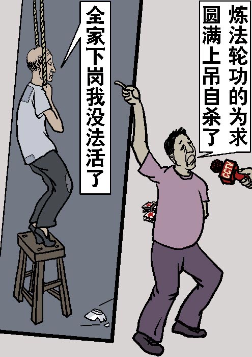 最著名的例子之一,是把李洪志先生在一次公開場合表示「所謂地球爆炸的事情是不存在的」中的「不」字剪掉,並以此誣衊法輪功宣傳「世界末日」。更有甚者,以移花接木等手段,把普通刑事罪犯的犯罪行為移植到法輪功學員頭上,以欺騙世人。如京城瘋子傅怡彬殺人、浙江乞丐毒殺案等等神經病、殺人犯都栽贓到法輪功頭上,然後利用媒體煽動不明真相的民眾對法輪功產生無端仇恨,為不得民心的血腥迫害尋找借口和支持者。