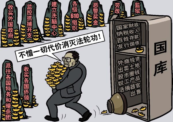 中共對國家財政的控制,成為江澤民迫害法輪功的經濟後盾。遼寧省司法廳高級官員曾經在遼寧省馬三家「勞動教養院」的大會上承認:「對付法輪功的財政投入已超過了一場戰爭的經費。」